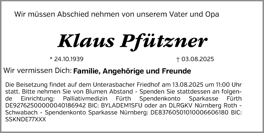 Hier finden Sie alle Traueranzeigen aus der Zeitung, die bisher für Klaus Pfützner erschienen sind. Weitere Traueranzeigen, die in der Zeitung erscheinen, werden hier ebenfalls aufgelistet