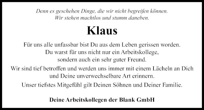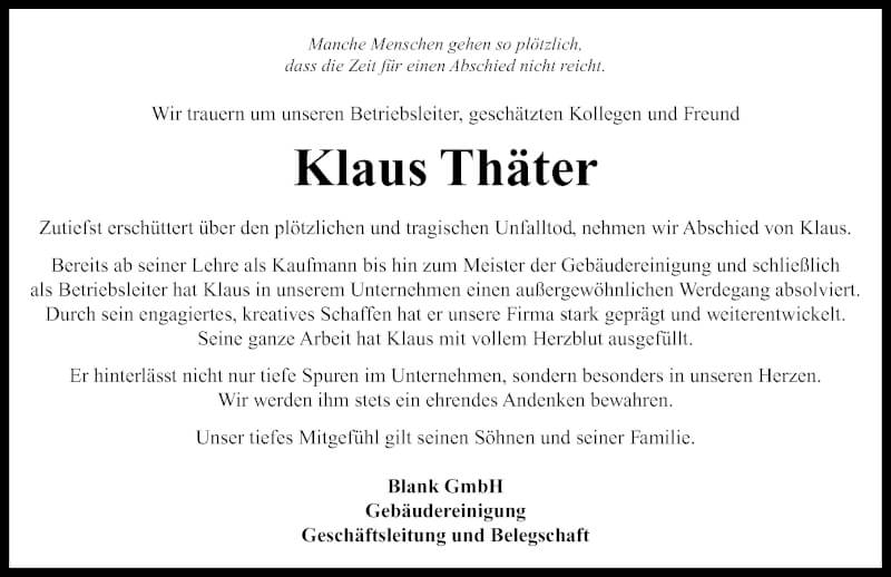 Hier finden Sie alle Traueranzeigen aus der Zeitung, die bisher für Klaus Thäter erschienen sind. Weitere Traueranzeigen, die in der Zeitung erscheinen, werden hier ebenfalls aufgelistet