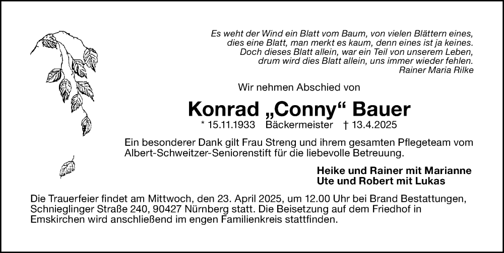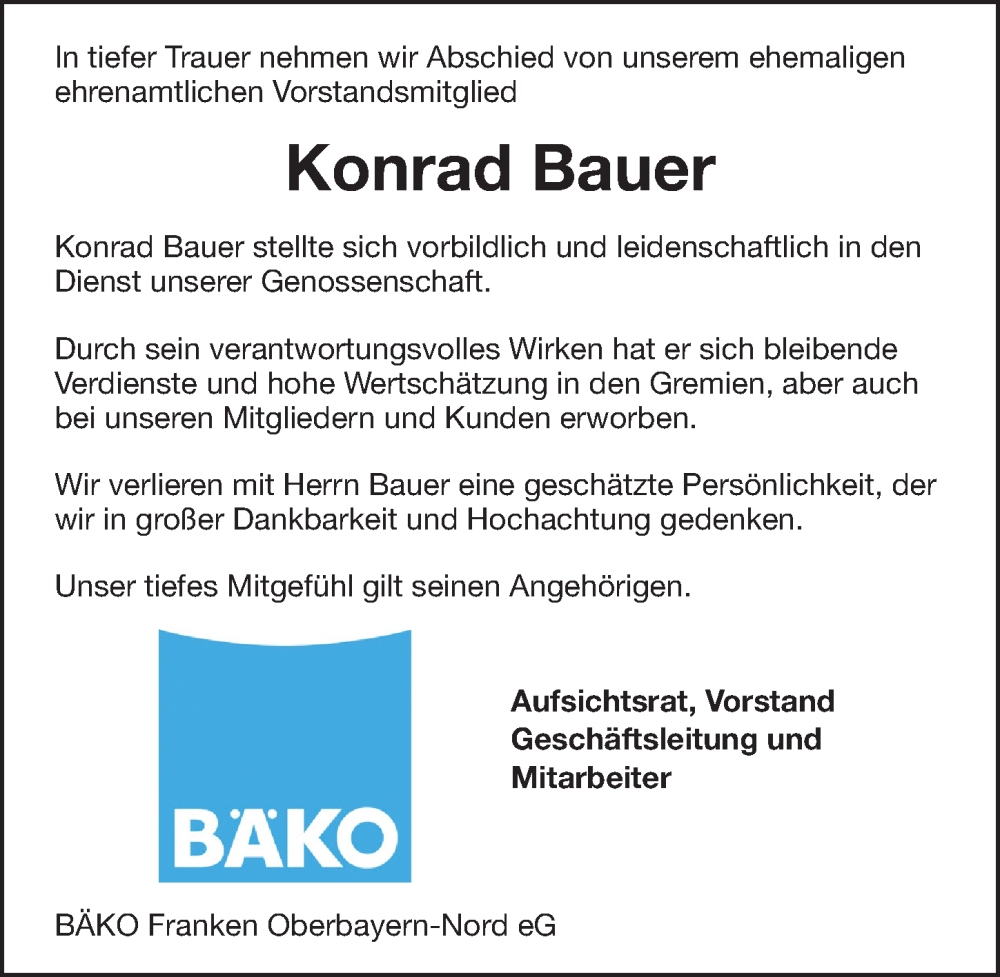 Hier finden Sie alle Traueranzeigen aus der Zeitung, die bisher für Konrad Bauer erschienen sind. Weitere Traueranzeigen, die in der Zeitung erscheinen, werden hier ebenfalls aufgelistet