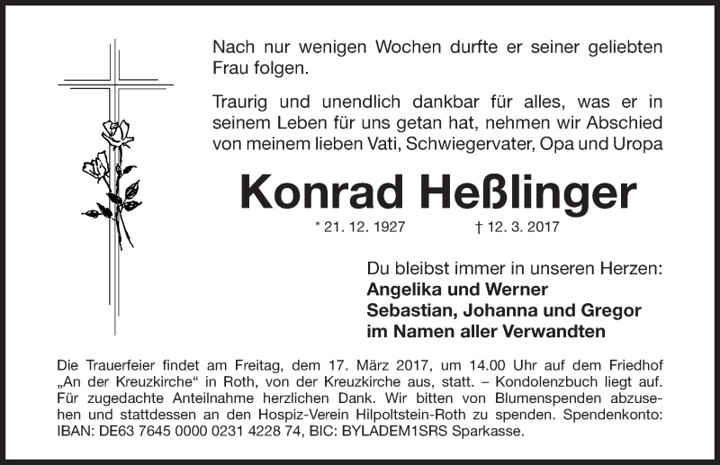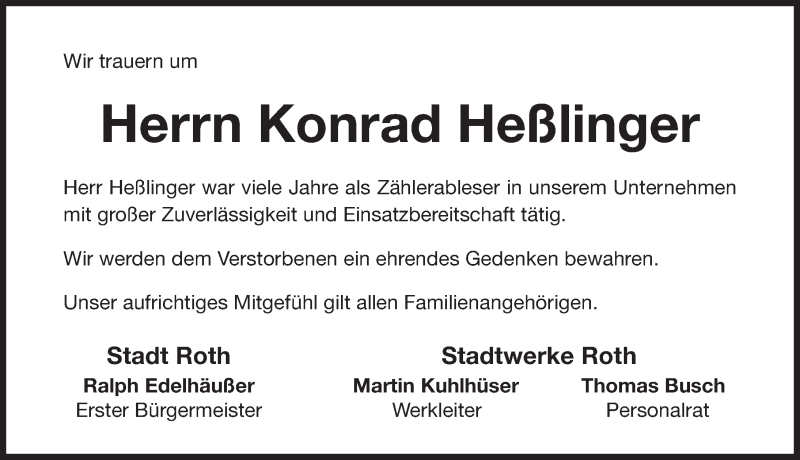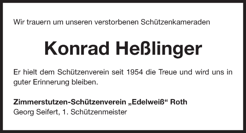 Hier finden Sie alle Traueranzeigen aus der Zeitung, die bisher für Konrad Heßlinger erschienen sind. Weitere Traueranzeigen, die in der Zeitung erscheinen, werden hier ebenfalls aufgelistet