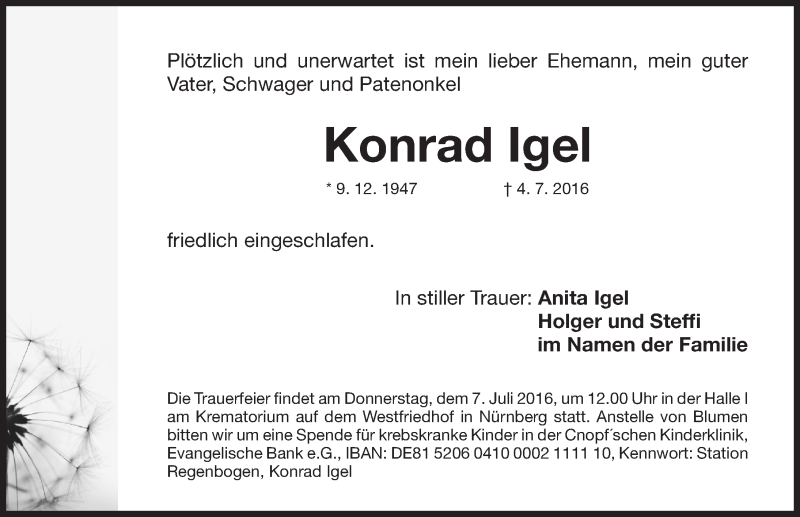 Hier finden Sie alle Traueranzeigen aus der Zeitung, die bisher für Konrad Igel erschienen sind. Weitere Traueranzeigen, die in der Zeitung erscheinen, werden hier ebenfalls aufgelistet