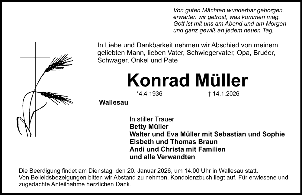 Hier finden Sie alle Traueranzeigen aus der Zeitung, die bisher für Konrad Müller erschienen sind. Weitere Traueranzeigen, die in der Zeitung erscheinen, werden hier ebenfalls aufgelistet
