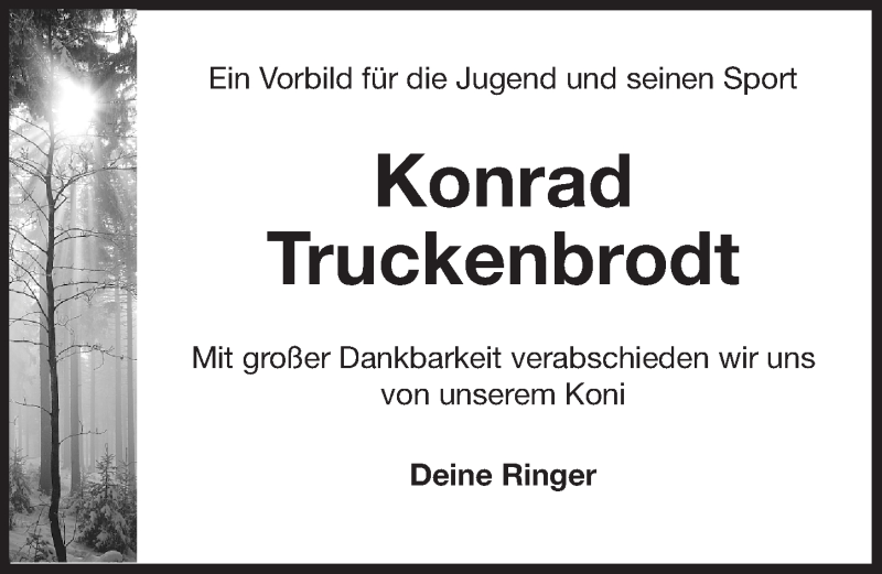 Hier finden Sie alle Traueranzeigen aus der Zeitung, die bisher für Konrad Truckenbrodt erschienen sind. Weitere Traueranzeigen, die in der Zeitung erscheinen, werden hier ebenfalls aufgelistet