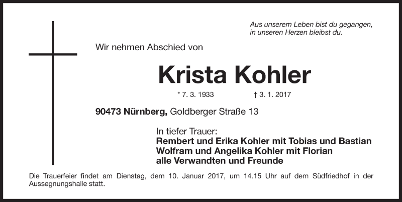 Hier finden Sie alle Traueranzeigen aus der Zeitung, die bisher für Krista Kohler erschienen sind. Weitere Traueranzeigen, die in der Zeitung erscheinen, werden hier ebenfalls aufgelistet