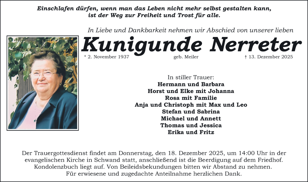 Hier finden Sie alle Traueranzeigen aus der Zeitung, die bisher für Kunigunde Nerreter erschienen sind. Weitere Traueranzeigen, die in der Zeitung erscheinen, werden hier ebenfalls aufgelistet