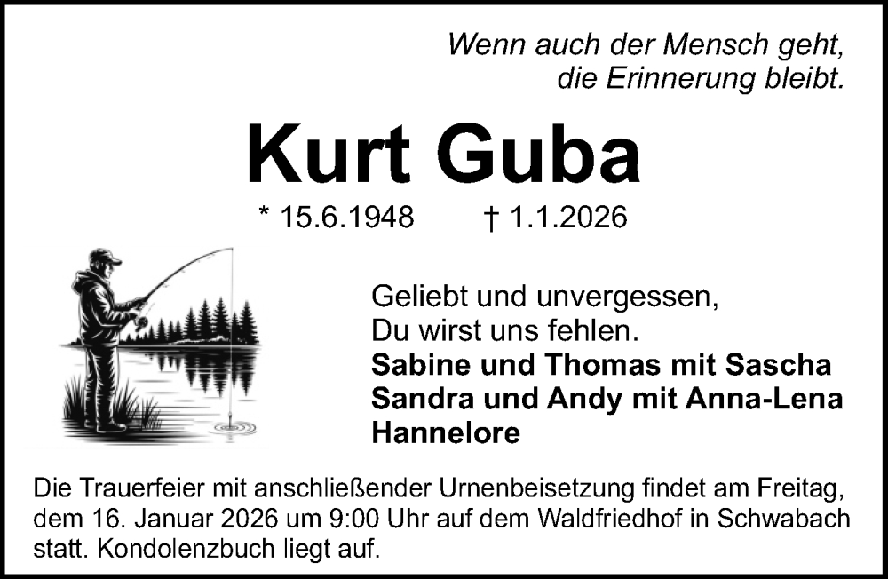 Hier finden Sie alle Traueranzeigen aus der Zeitung, die bisher für Kurt Guba erschienen sind. Weitere Traueranzeigen, die in der Zeitung erscheinen, werden hier ebenfalls aufgelistet
