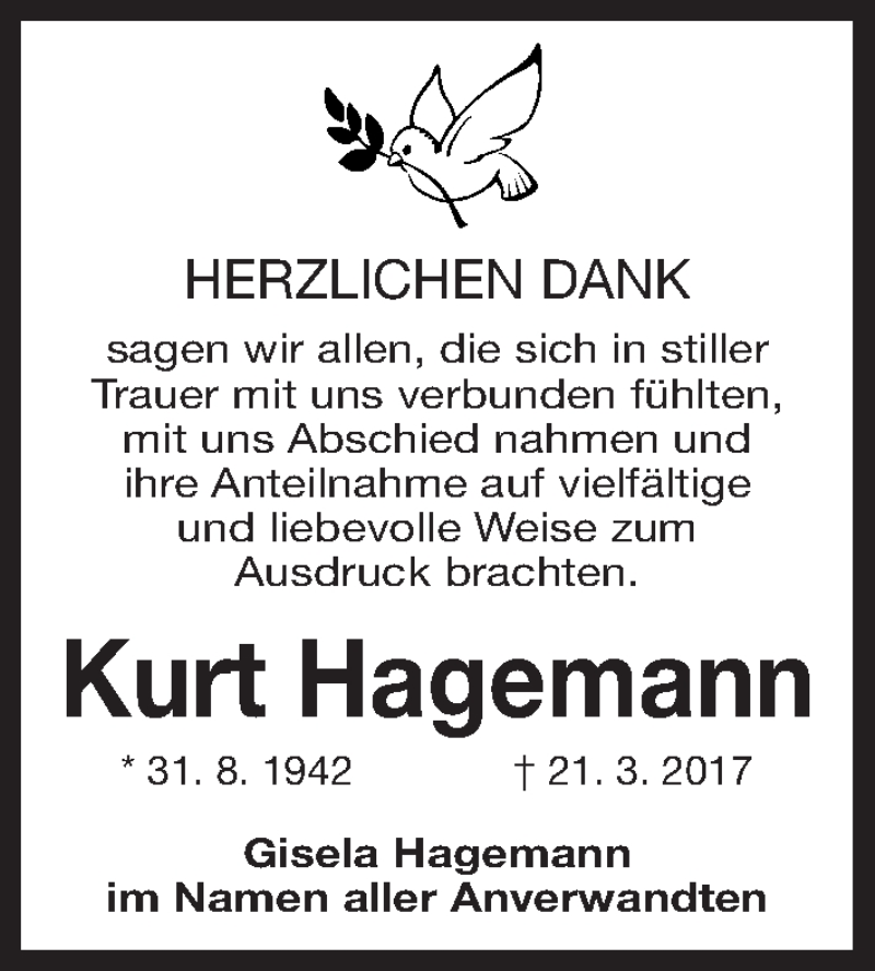 Hier finden Sie alle Traueranzeigen aus der Zeitung, die bisher für Kurt Hagemann erschienen sind. Weitere Traueranzeigen, die in der Zeitung erscheinen, werden hier ebenfalls aufgelistet