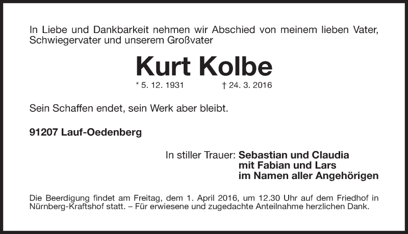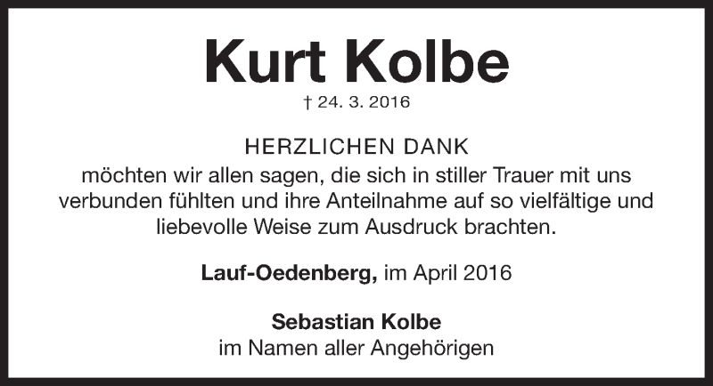 Hier finden Sie alle Traueranzeigen aus der Zeitung, die bisher für Kurt Kolbe erschienen sind. Weitere Traueranzeigen, die in der Zeitung erscheinen, werden hier ebenfalls aufgelistet