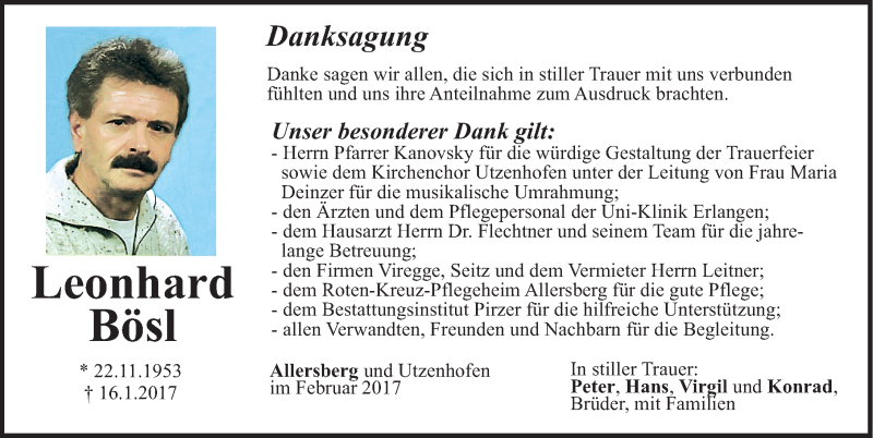 Hier finden Sie alle Traueranzeigen aus der Zeitung, die bisher für Leonhard Bösl erschienen sind. Weitere Traueranzeigen, die in der Zeitung erscheinen, werden hier ebenfalls aufgelistet
