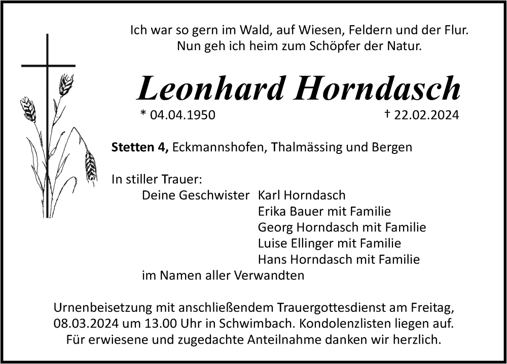 Hier finden Sie alle Traueranzeigen aus der Zeitung, die bisher für Leonhard Horndasch erschienen sind. Weitere Traueranzeigen, die in der Zeitung erscheinen, werden hier ebenfalls aufgelistet