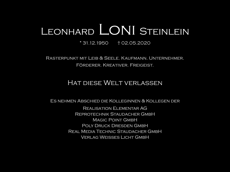 Hier finden Sie alle Traueranzeigen aus der Zeitung, die bisher für Leonhard Steinlein erschienen sind. Weitere Traueranzeigen, die in der Zeitung erscheinen, werden hier ebenfalls aufgelistet
