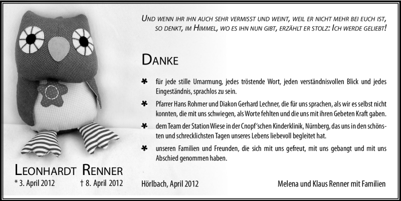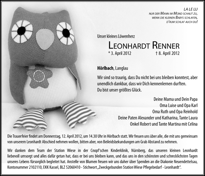 Hier finden Sie alle Traueranzeigen aus der Zeitung, die bisher für Leonhardt Renner erschienen sind. Weitere Traueranzeigen, die in der Zeitung erscheinen, werden hier ebenfalls aufgelistet