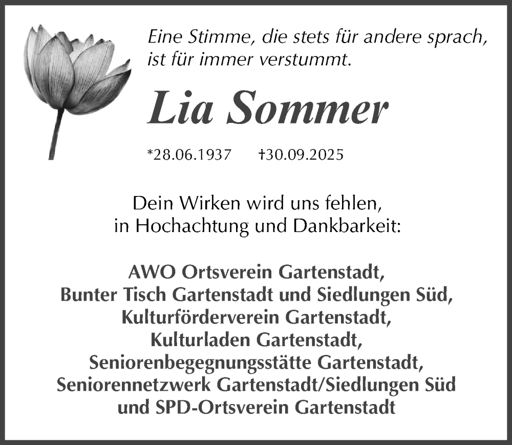 Hier finden Sie alle Traueranzeigen aus der Zeitung, die bisher für Lia Sommer erschienen sind. Weitere Traueranzeigen, die in der Zeitung erscheinen, werden hier ebenfalls aufgelistet