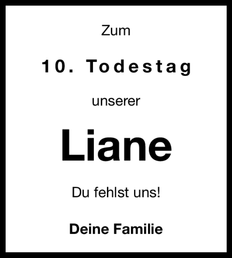Hier finden Sie alle Traueranzeigen aus der Zeitung, die bisher für Liane erschienen sind. Weitere Traueranzeigen, die in der Zeitung erscheinen, werden hier ebenfalls aufgelistet