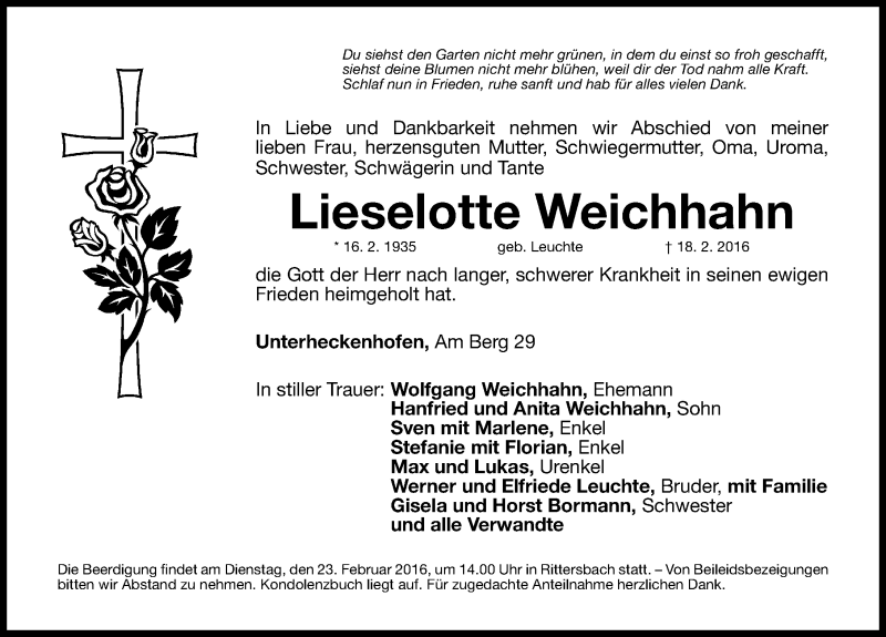 Hier finden Sie alle Traueranzeigen aus der Zeitung, die bisher für Lieselotte Weichhahn erschienen sind. Weitere Traueranzeigen, die in der Zeitung erscheinen, werden hier ebenfalls aufgelistet