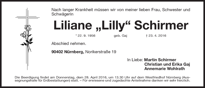 Hier finden Sie alle Traueranzeigen aus der Zeitung, die bisher für Liliane Lilly Schirmer erschienen sind. Weitere Traueranzeigen, die in der Zeitung erscheinen, werden hier ebenfalls aufgelistet