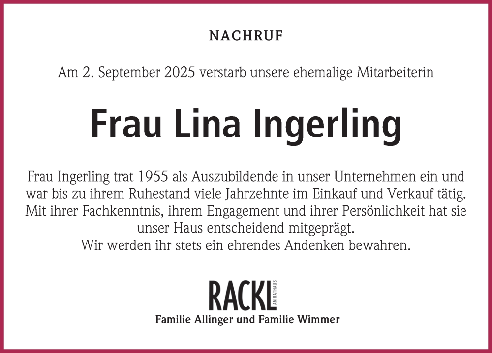 Hier finden Sie alle Traueranzeigen aus der Zeitung, die bisher für Lina Ingerling erschienen sind. Weitere Traueranzeigen, die in der Zeitung erscheinen, werden hier ebenfalls aufgelistet