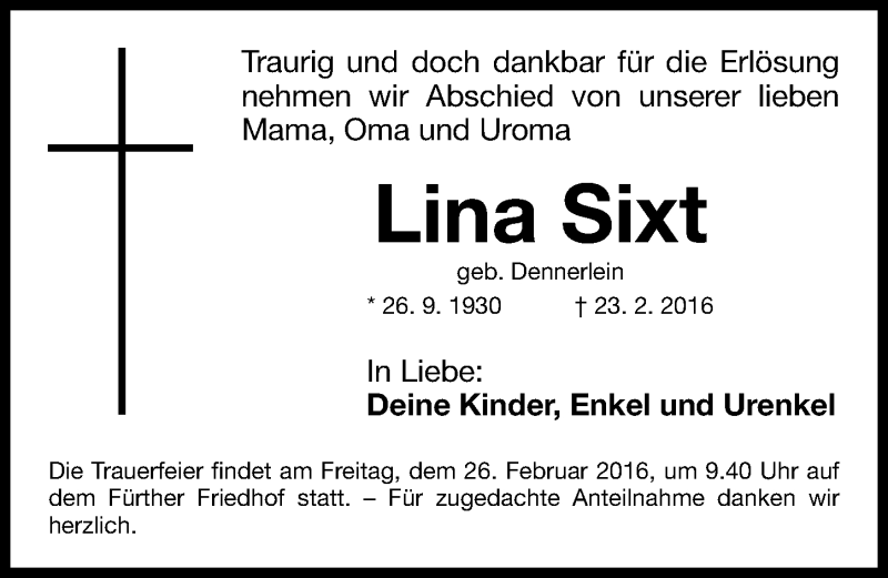 Hier finden Sie alle Traueranzeigen aus der Zeitung, die bisher für Lina Sixt erschienen sind. Weitere Traueranzeigen, die in der Zeitung erscheinen, werden hier ebenfalls aufgelistet