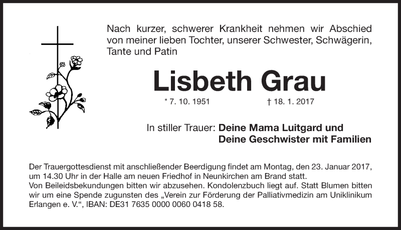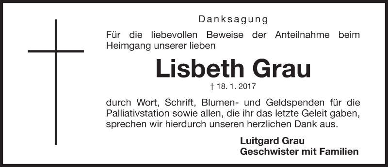 Hier finden Sie alle Traueranzeigen aus der Zeitung, die bisher für Lisbeth Grau erschienen sind. Weitere Traueranzeigen, die in der Zeitung erscheinen, werden hier ebenfalls aufgelistet