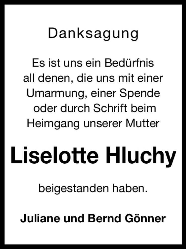 Hier finden Sie alle Traueranzeigen aus der Zeitung, die bisher für Liselotte Hluchy erschienen sind. Weitere Traueranzeigen, die in der Zeitung erscheinen, werden hier ebenfalls aufgelistet