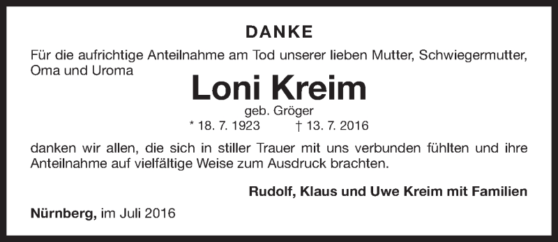 Hier finden Sie alle Traueranzeigen aus der Zeitung, die bisher für Loni Kreim erschienen sind. Weitere Traueranzeigen, die in der Zeitung erscheinen, werden hier ebenfalls aufgelistet