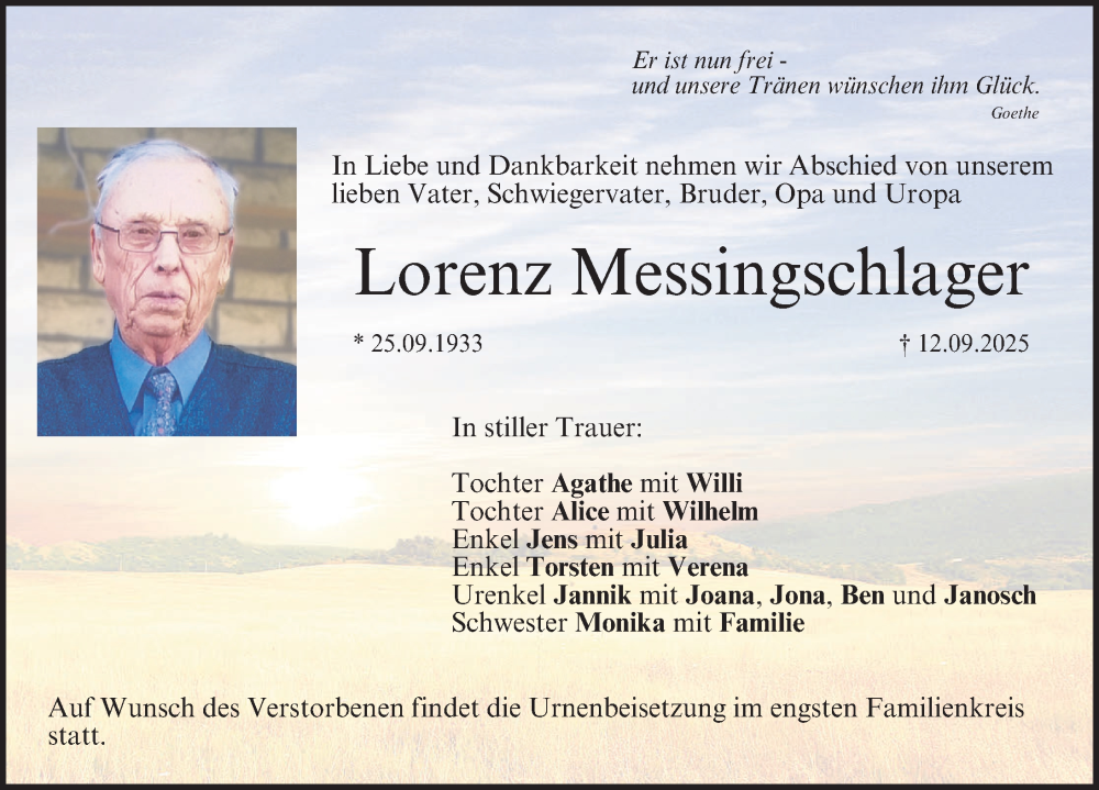 Hier finden Sie alle Traueranzeigen aus der Zeitung, die bisher für Lorenz Messingschlager erschienen sind. Weitere Traueranzeigen, die in der Zeitung erscheinen, werden hier ebenfalls aufgelistet