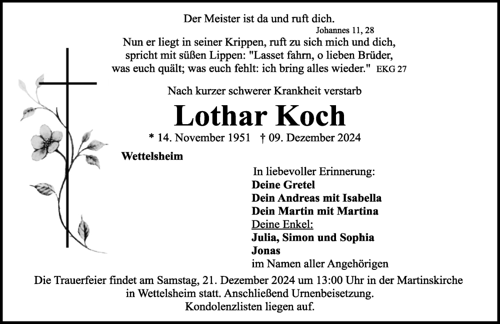 Hier finden Sie alle Traueranzeigen aus der Zeitung, die bisher für Lothar Koch erschienen sind. Weitere Traueranzeigen, die in der Zeitung erscheinen, werden hier ebenfalls aufgelistet