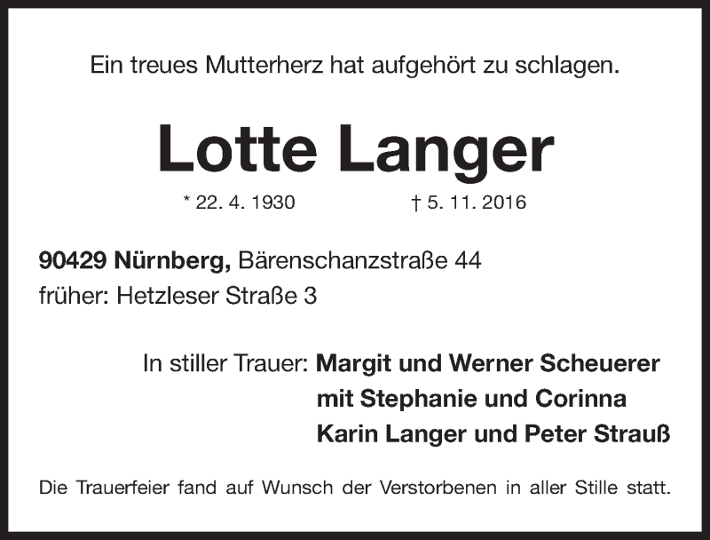 Hier finden Sie alle Traueranzeigen aus der Zeitung, die bisher für Lotte Langer erschienen sind. Weitere Traueranzeigen, die in der Zeitung erscheinen, werden hier ebenfalls aufgelistet