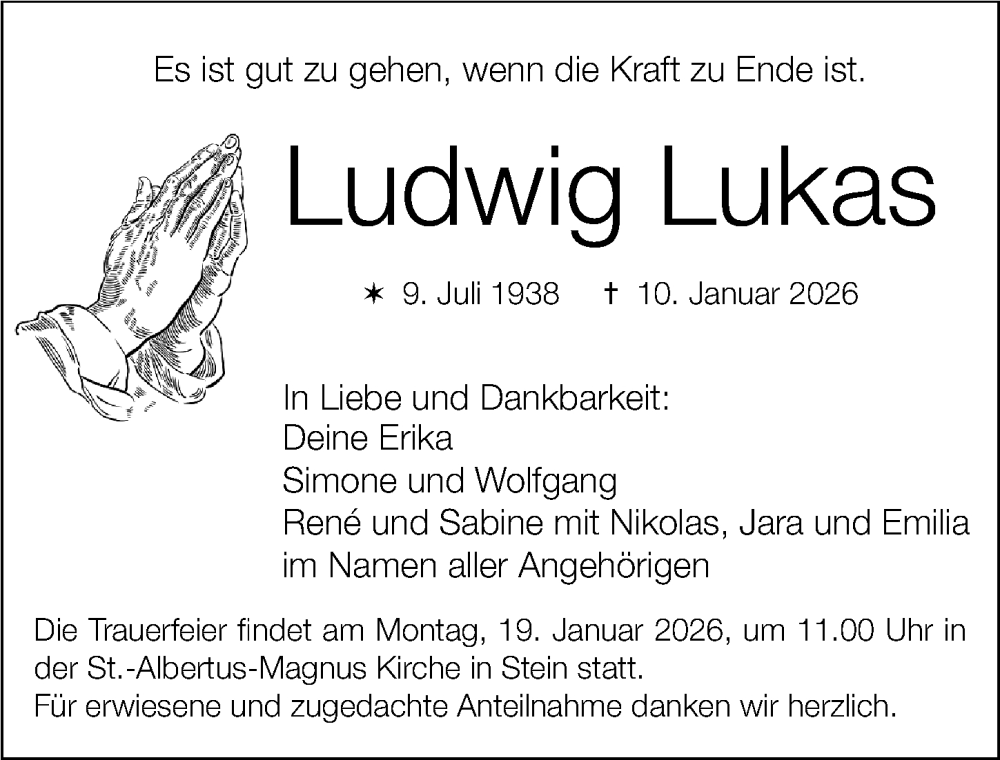 Hier finden Sie alle Traueranzeigen aus der Zeitung, die bisher für Ludwig Lukas erschienen sind. Weitere Traueranzeigen, die in der Zeitung erscheinen, werden hier ebenfalls aufgelistet