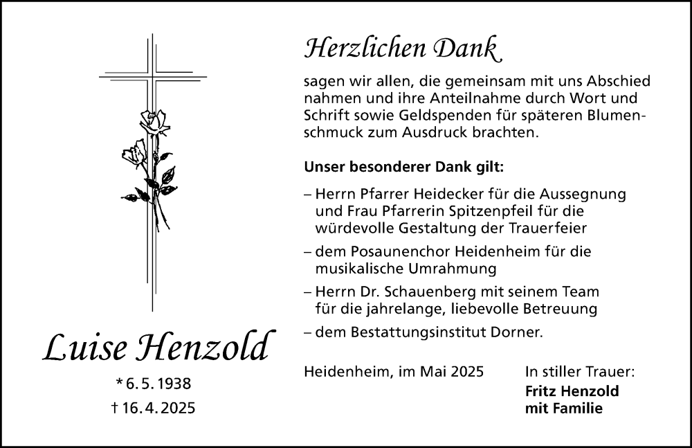 Hier finden Sie alle Traueranzeigen aus der Zeitung, die bisher für Luise Henzold erschienen sind. Weitere Traueranzeigen, die in der Zeitung erscheinen, werden hier ebenfalls aufgelistet