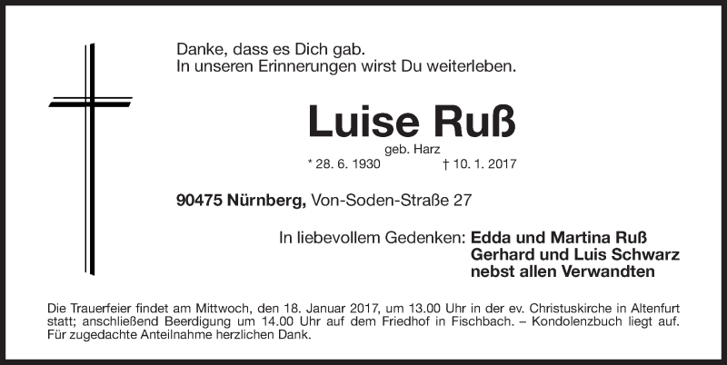 Hier finden Sie alle Traueranzeigen aus der Zeitung, die bisher für Luise Ruß erschienen sind. Weitere Traueranzeigen, die in der Zeitung erscheinen, werden hier ebenfalls aufgelistet