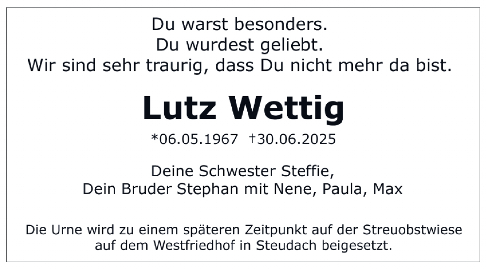 Hier finden Sie alle Traueranzeigen aus der Zeitung, die bisher für Lutz Wettig erschienen sind. Weitere Traueranzeigen, die in der Zeitung erscheinen, werden hier ebenfalls aufgelistet