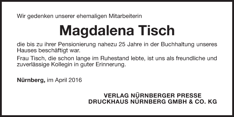 Hier finden Sie alle Traueranzeigen aus der Zeitung, die bisher für Magdalena Tisch erschienen sind. Weitere Traueranzeigen, die in der Zeitung erscheinen, werden hier ebenfalls aufgelistet