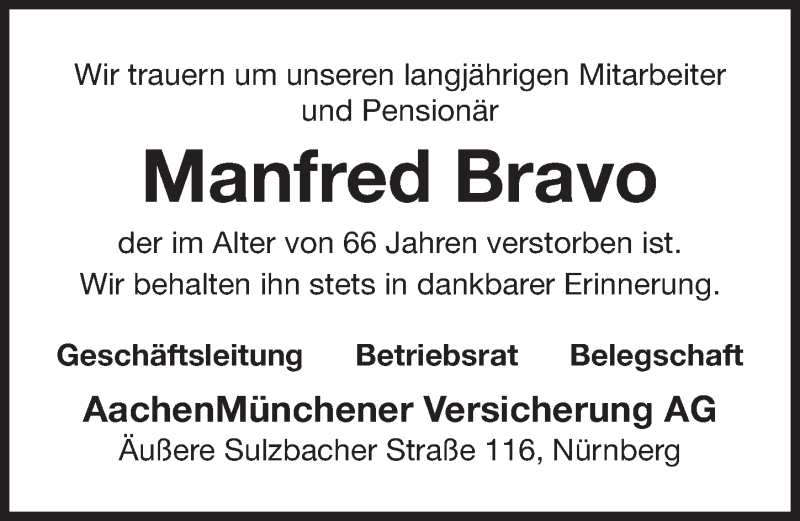 Hier finden Sie alle Traueranzeigen aus der Zeitung, die bisher für Manfred Bravo erschienen sind. Weitere Traueranzeigen, die in der Zeitung erscheinen, werden hier ebenfalls aufgelistet