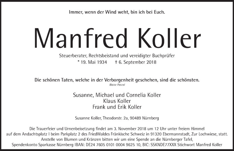 Hier finden Sie alle Traueranzeigen aus der Zeitung, die bisher für Manfred Koller erschienen sind. Weitere Traueranzeigen, die in der Zeitung erscheinen, werden hier ebenfalls aufgelistet