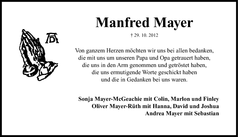 Hier finden Sie alle Traueranzeigen aus der Zeitung, die bisher für Manfred Mayer erschienen sind. Weitere Traueranzeigen, die in der Zeitung erscheinen, werden hier ebenfalls aufgelistet