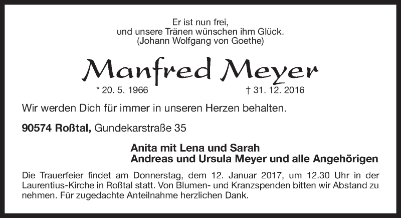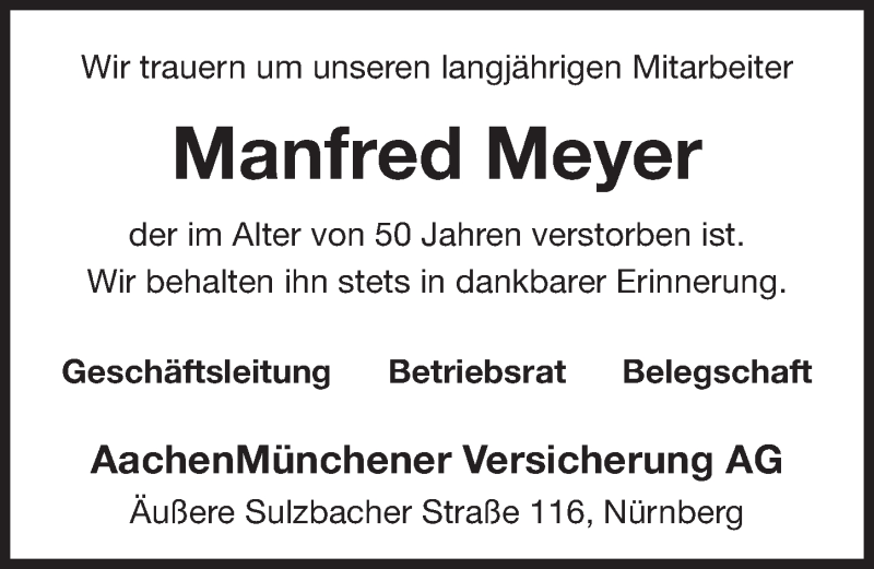 Hier finden Sie alle Traueranzeigen aus der Zeitung, die bisher für Manfred Meyer erschienen sind. Weitere Traueranzeigen, die in der Zeitung erscheinen, werden hier ebenfalls aufgelistet