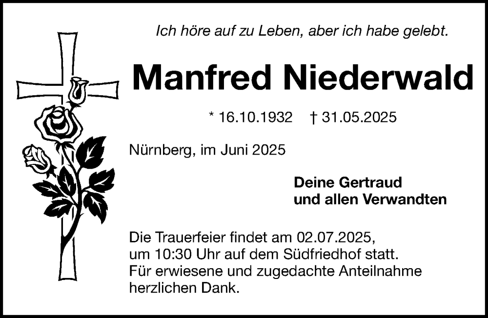 Hier finden Sie alle Traueranzeigen aus der Zeitung, die bisher für Manfred Niederwald erschienen sind. Weitere Traueranzeigen, die in der Zeitung erscheinen, werden hier ebenfalls aufgelistet