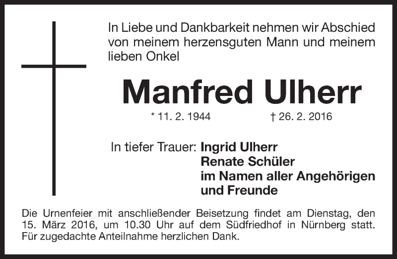Hier finden Sie alle Traueranzeigen aus der Zeitung, die bisher für Manfred Ulherr erschienen sind. Weitere Traueranzeigen, die in der Zeitung erscheinen, werden hier ebenfalls aufgelistet