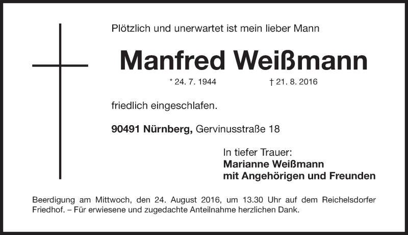 Hier finden Sie alle Traueranzeigen aus der Zeitung, die bisher für Manfred Weißmann erschienen sind. Weitere Traueranzeigen, die in der Zeitung erscheinen, werden hier ebenfalls aufgelistet