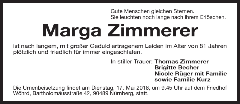 Hier finden Sie alle Traueranzeigen aus der Zeitung, die bisher für Marga Zimmerer erschienen sind. Weitere Traueranzeigen, die in der Zeitung erscheinen, werden hier ebenfalls aufgelistet