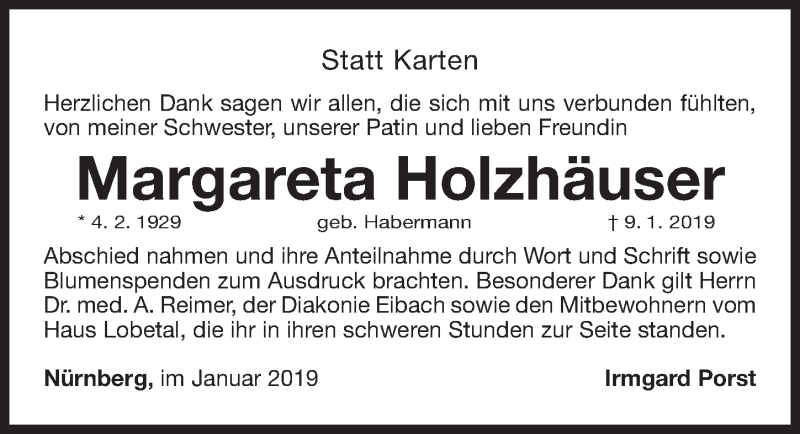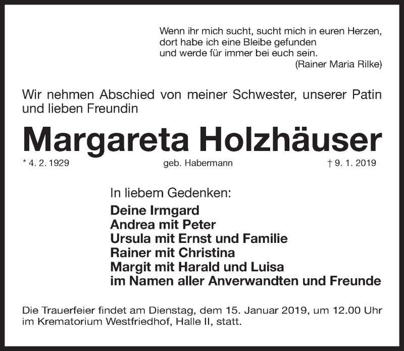 Hier finden Sie alle Traueranzeigen aus der Zeitung, die bisher für Margareta Holzhäuser erschienen sind. Weitere Traueranzeigen, die in der Zeitung erscheinen, werden hier ebenfalls aufgelistet