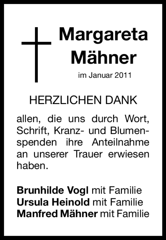 Hier finden Sie alle Traueranzeigen aus der Zeitung, die bisher für Margareta Mähner erschienen sind. Weitere Traueranzeigen, die in der Zeitung erscheinen, werden hier ebenfalls aufgelistet