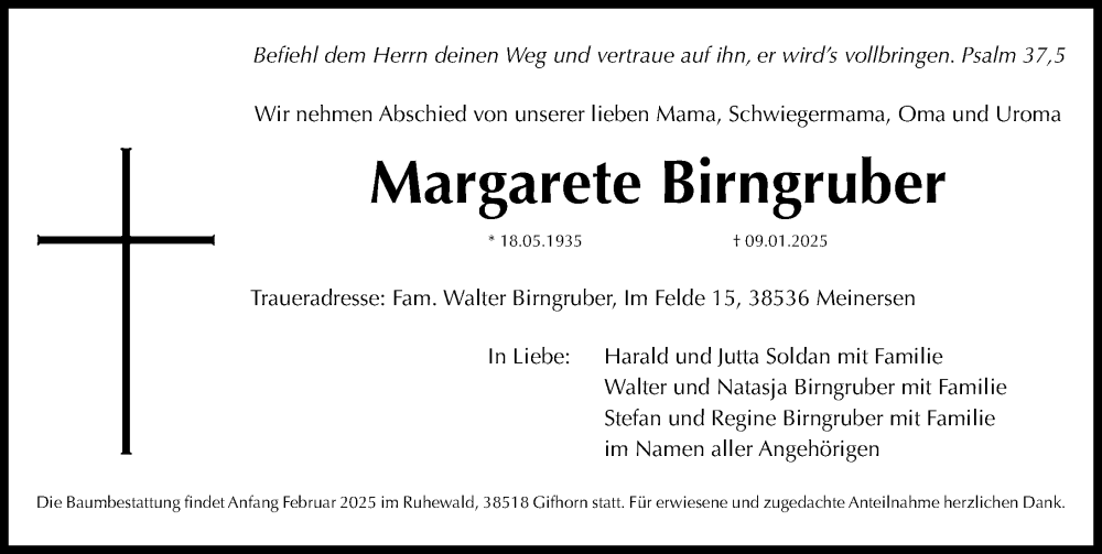 Hier finden Sie alle Traueranzeigen aus der Zeitung, die bisher für Margarete Birngruber erschienen sind. Weitere Traueranzeigen, die in der Zeitung erscheinen, werden hier ebenfalls aufgelistet