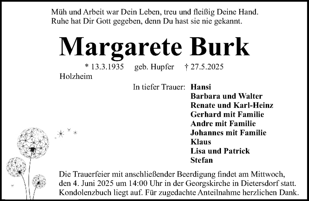 Hier finden Sie alle Traueranzeigen aus der Zeitung, die bisher für Margarete Burk erschienen sind. Weitere Traueranzeigen, die in der Zeitung erscheinen, werden hier ebenfalls aufgelistet