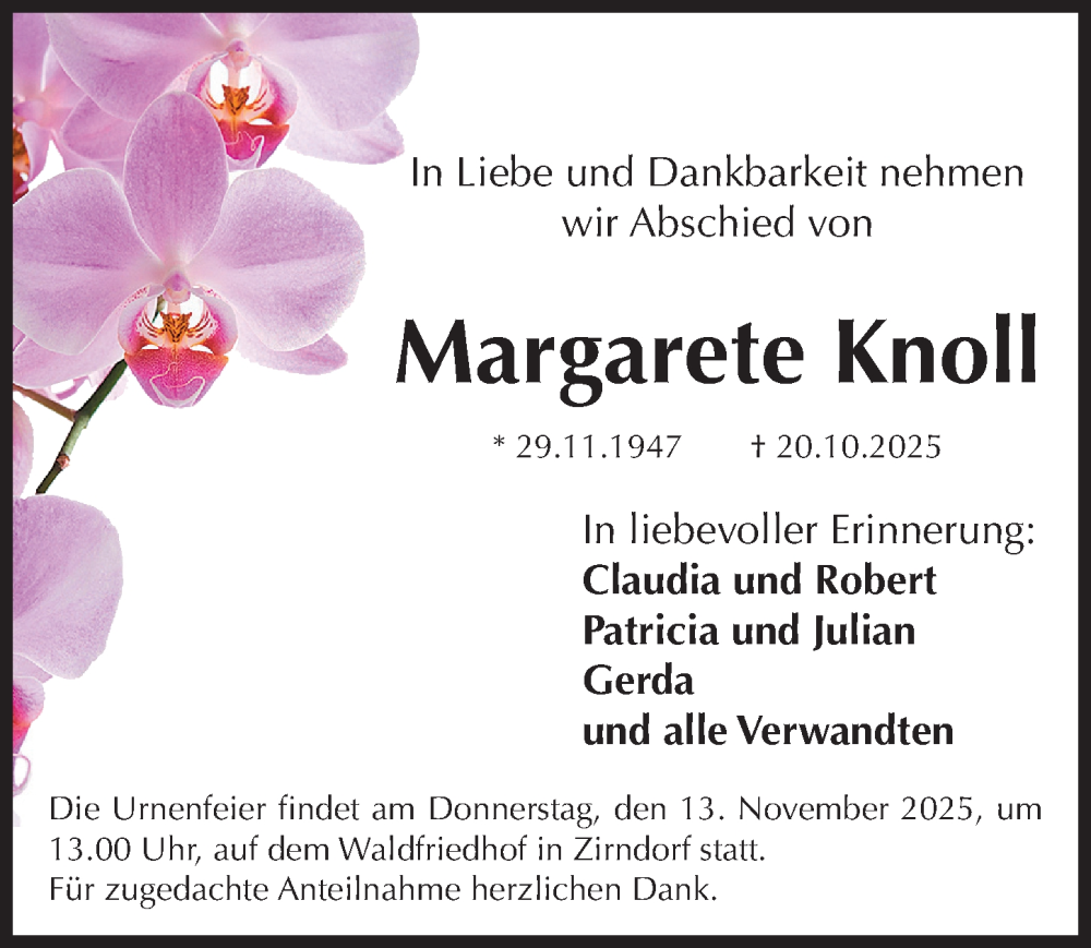 Hier finden Sie alle Traueranzeigen aus der Zeitung, die bisher für Margarete Knoll erschienen sind. Weitere Traueranzeigen, die in der Zeitung erscheinen, werden hier ebenfalls aufgelistet
