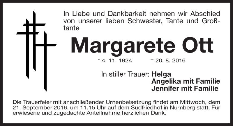 Hier finden Sie alle Traueranzeigen aus der Zeitung, die bisher für Margarete Ott erschienen sind. Weitere Traueranzeigen, die in der Zeitung erscheinen, werden hier ebenfalls aufgelistet