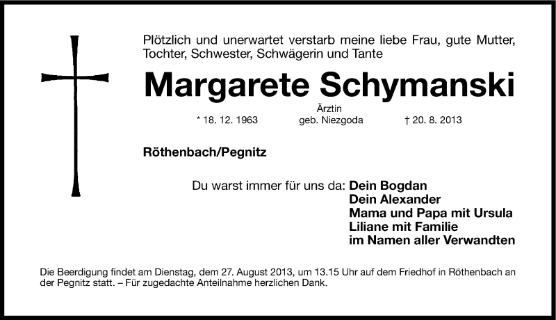 Hier finden Sie alle Traueranzeigen aus der Zeitung, die bisher für Margarete Schymanski erschienen sind. Weitere Traueranzeigen, die in der Zeitung erscheinen, werden hier ebenfalls aufgelistet