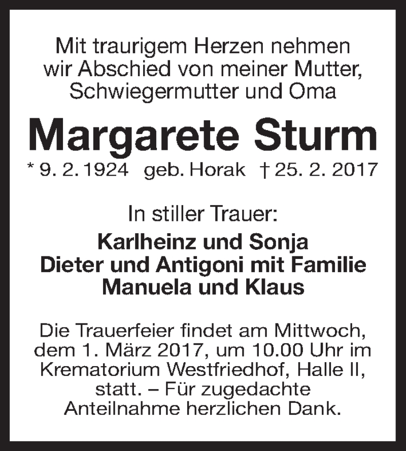 Hier finden Sie alle Traueranzeigen aus der Zeitung, die bisher für Margarete Sturm erschienen sind. Weitere Traueranzeigen, die in der Zeitung erscheinen, werden hier ebenfalls aufgelistet