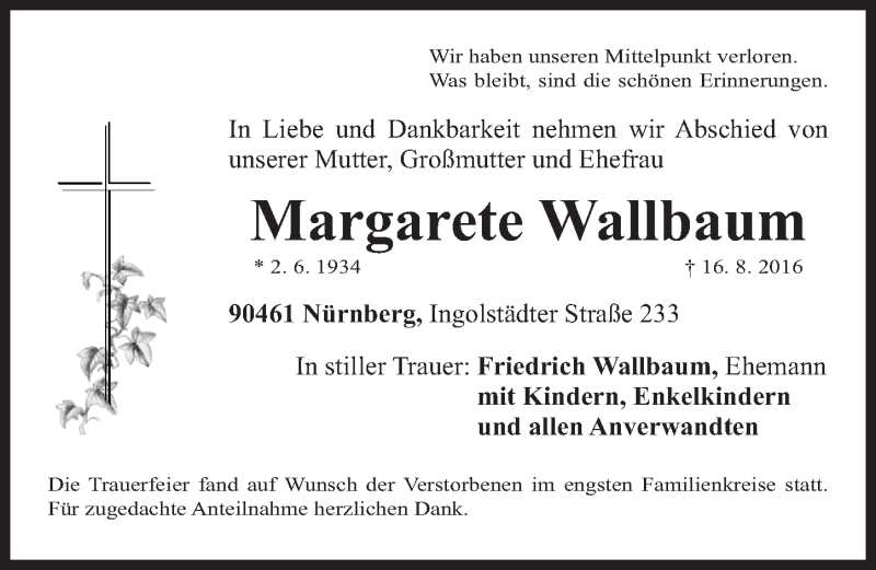 Hier finden Sie alle Traueranzeigen aus der Zeitung, die bisher für Margarete Wallbaum erschienen sind. Weitere Traueranzeigen, die in der Zeitung erscheinen, werden hier ebenfalls aufgelistet